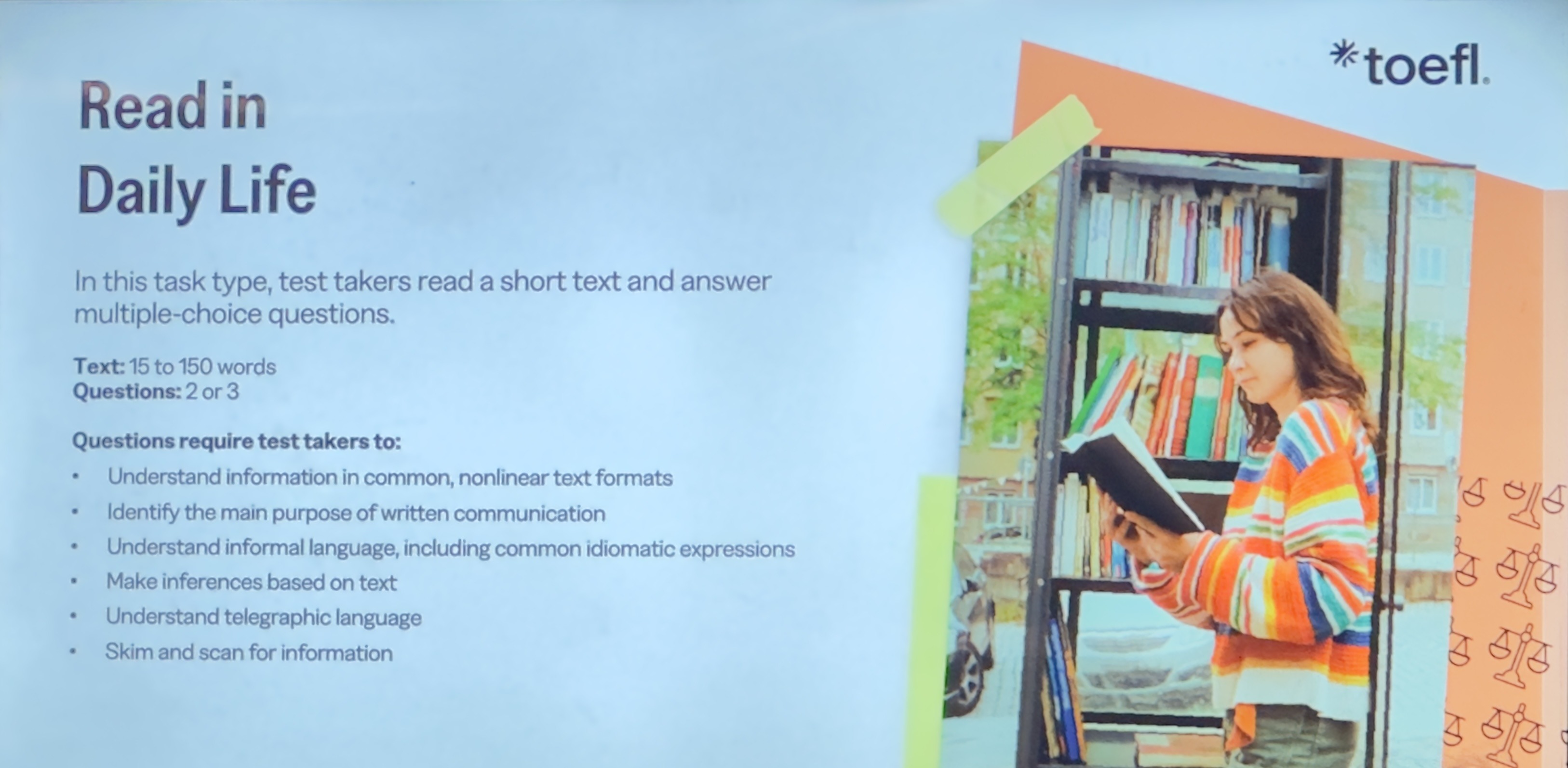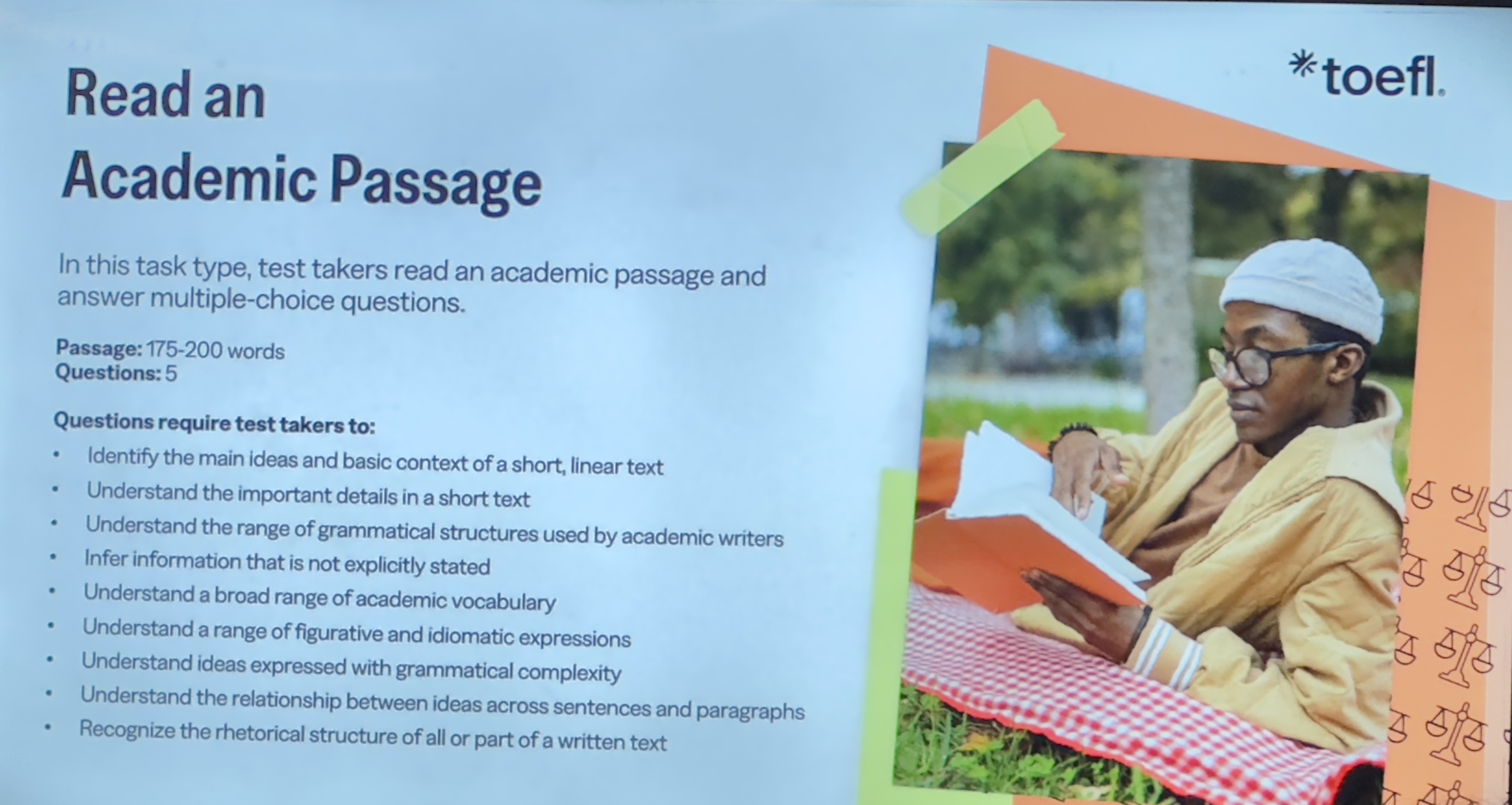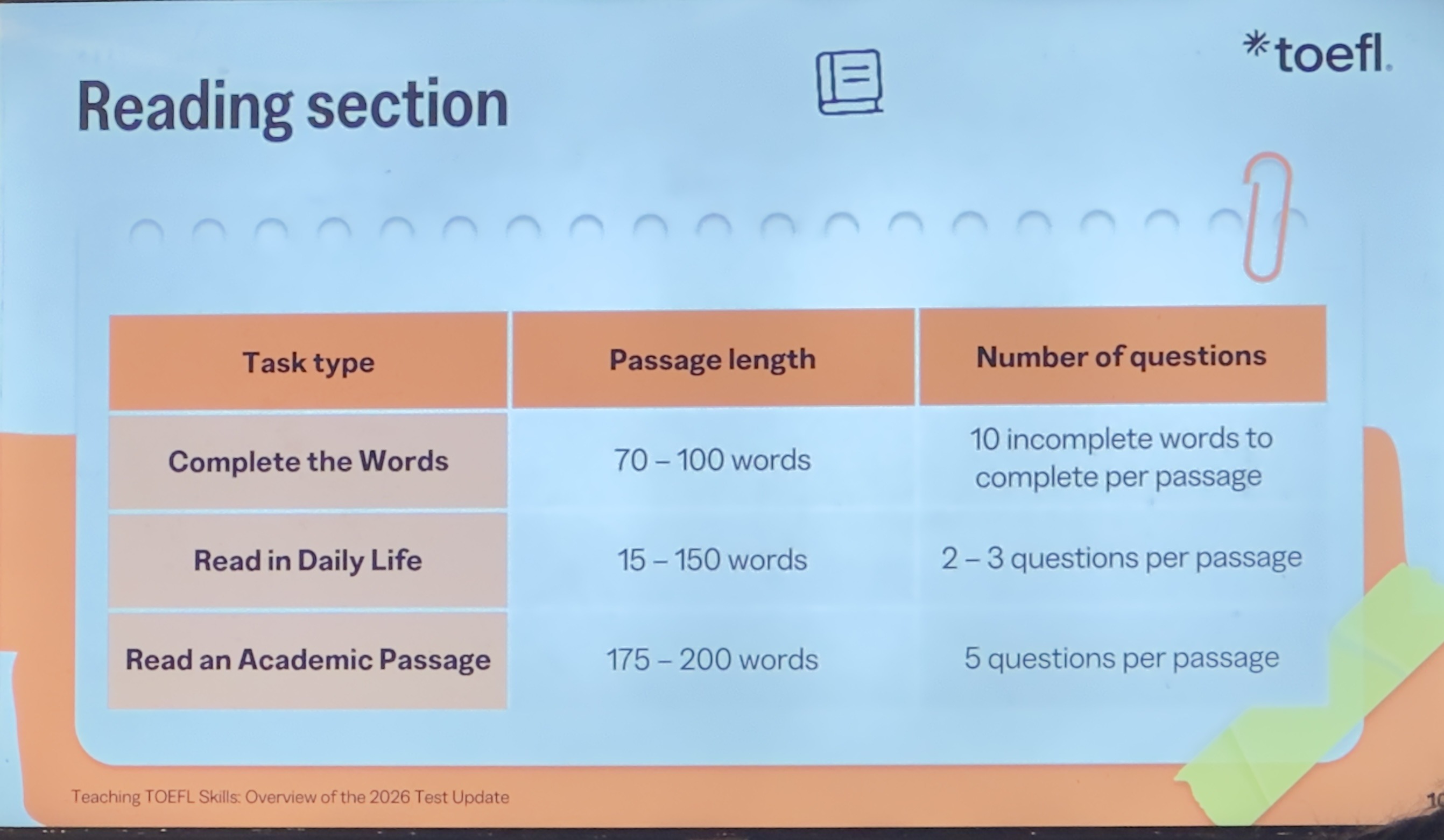 Writing condenses to 12 tasks in 23 minutes, incorporating sentence building, email responses, and academic discussions requiring summaries. This evolves from the previous integrated (20 minutes) and independent (30 minutes) tasks, prioritizing practical writing like concise arguments over lengthy essays. The format tests quick synthesis and clarity for academic contexts.