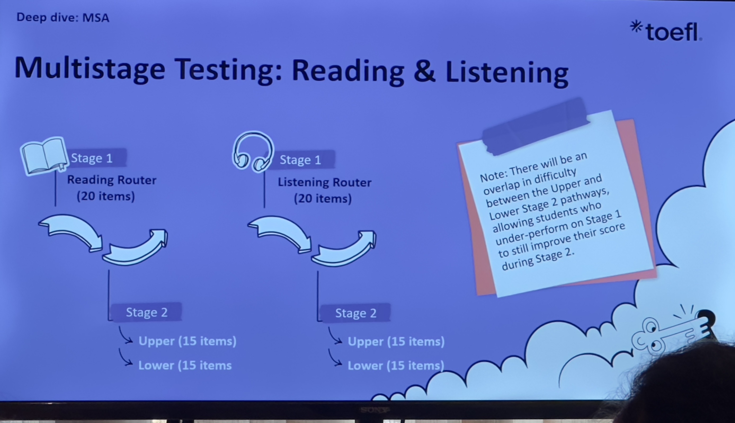 Similar to Reading, Listening adopts adaptive testing with 35-48 items in 18-27 minutes, covering lectures (3 items, 3-5 minutes each with 6 questions) and conversations (2 items, 3 minutes each with 5 questions). Content modernizes to include campus dialogues, podcasts, and global academic discussions, eliminating random unscored items from the old 41-57 minute structure. Visuals like graphs enhance integrated listening skills.